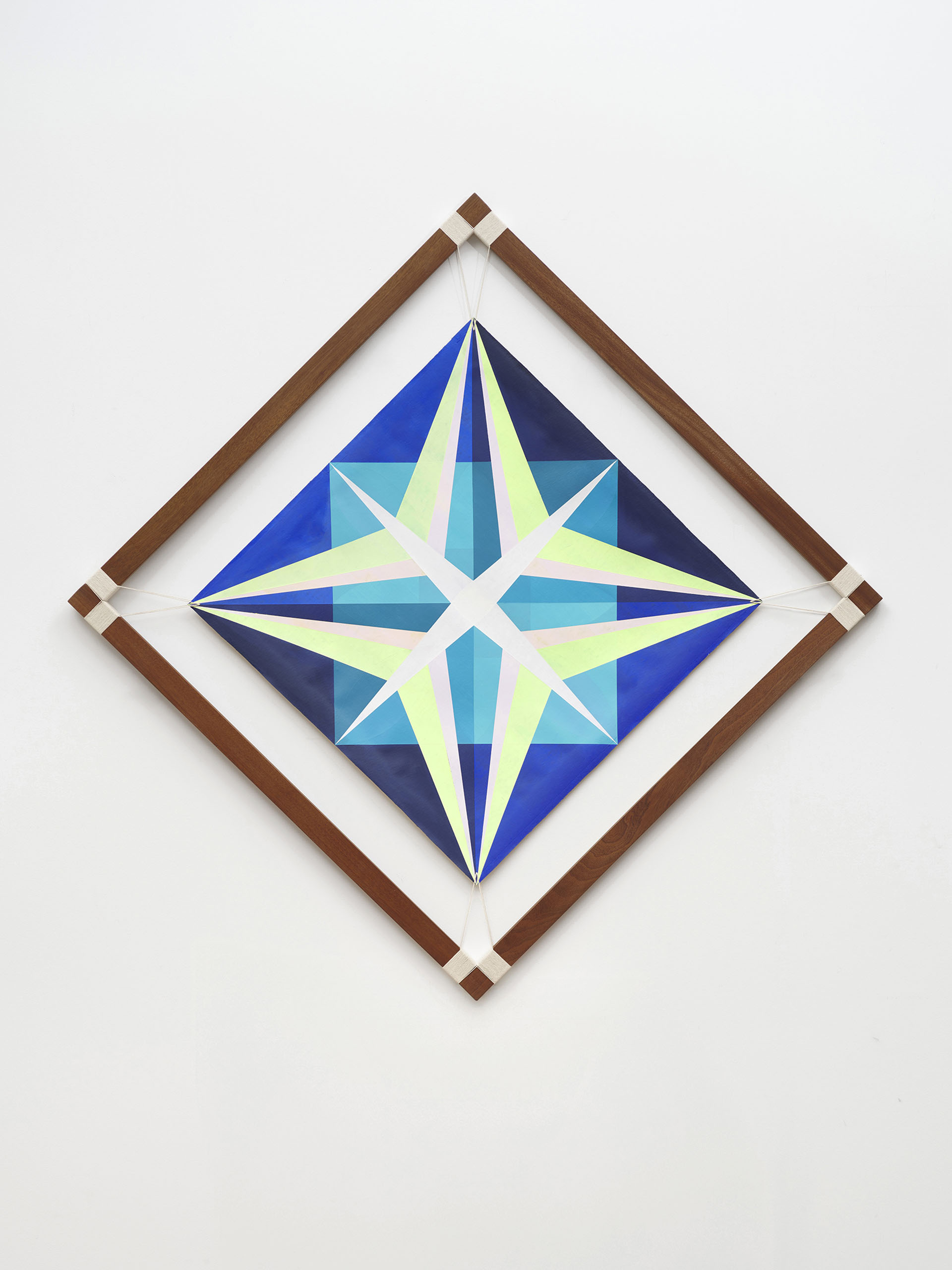 At the center of the composition, a geometric star-like form radiates outward. The structure suggests movement and expansion, while the wooden frame establishes a boundary that contains and stabilizes this outward force.